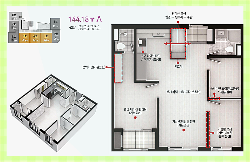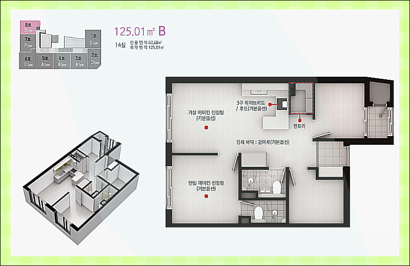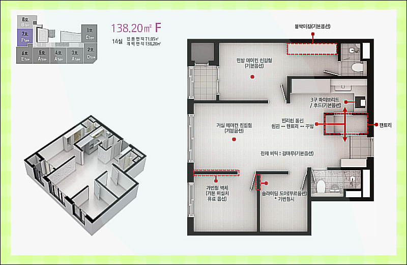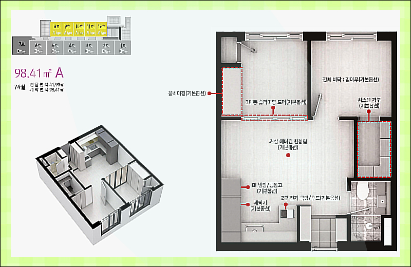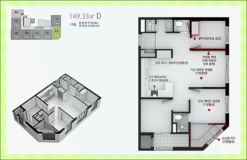 기흥역 엘리시아트윈 단지의 3룸 타입은 일반적인 오피스텔 범주를 넘어선 설계를 보여줍니다. 전용 79㎡ 기준의 D타입은 3베이·3룸 구조에 더해 안방, 거실 모두에 천장형 에어컨이 설치되며, 고급 강마루 마감, 유상 옵션으로 제공되는 가변형 벽체까지 더해져 아파트급 주거 쾌적성을 구현합니다.