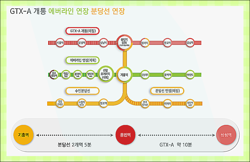 기흥역 엘리시아트윈이 가진 입지적 장점도 놓쳐선 안 됩니다. 수도권 남부의 핵심 축이라 불리는 기흥 일대는 이미 수인분당선 기흥역과 용인경전철이 교차하는 더블역세권이며, 2025년 GTX-A 노선의 용인역(구성역) 개통이 예정되어 있는 교통 중심지입니다.
