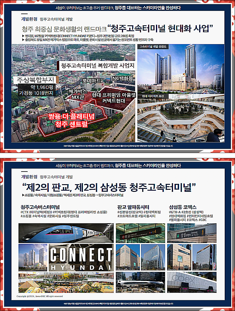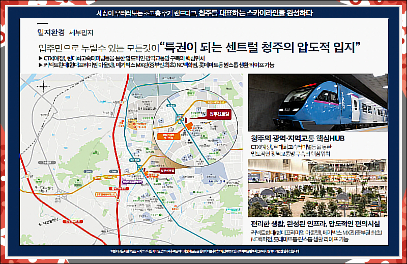 청주 쌍용 더 플래티넘은 압도적인 입지환경에 더해 CTX 광역철도와 청주고속터미널 등 다양한 개발이 예정되어 있어 높은 미래가치를 품고 있습니다. CTX 광역철도는 2034년 개통을 목표로 하고 있는 사업으로, 대전~세종~청주를 이어 "충청권 1시간 시대"를 열어줄 것으로 기대되고 있습니다. 해당 개발 사업은 수도권의 GTX와 같은 180KM의 시속으로 충청도 지역을 더욱 빠르고 편리하게 이동이 가능하도록 합니다. 또한, 청주 최중심에서 문화생활의 랜드마크로 거듭날 청주고속터미널 현대화 사업은 해당 단지 인근으로 진행되어 더욱 다양한 생활인프라가 조성될 것으로 기대되고 있는데요. 현대 프리미엄 아울렛 커넥트현대와 충청북도 유일 MX관 메가박스 등의 입접되어 마트와 아울렛, 문화시설을 한 곳에서 즐길 수 있는 환경이 조성될 것으로 많은 관심을 받고 있는 사업입니다. 해당 사업이 완료되면, 유동인구가 증가하고 경제가 활성화되어 청주 쌍용 더 플래티넘 분양가에도 긍정적인 영향을 미칠 것으로 기대되어 많은 실수요자와 투자자들에게 관심 받고 있는 단지인데요. 이외에도 다양한 사업이 진행 중인 곳으로 앞으로의 미래가 더욱 기대되는 단지입니다.