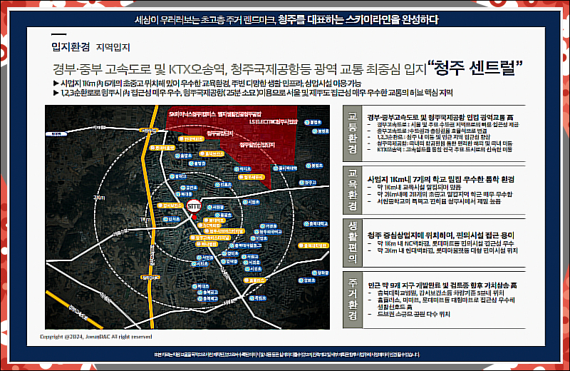청주 쌍용 더 플래티넘은 청주의 중심 입지를 갖추고 있는데요. 우선, 교통환경으로, 경부고속도로와 중부고속도로, 청주국제공항, KTX오송역 등이 위치하여 서울뿐 아니라 전국 주요 도시, 나아가 해외로의 이동까지 용이한 환경을 자랑하고 있습니다.